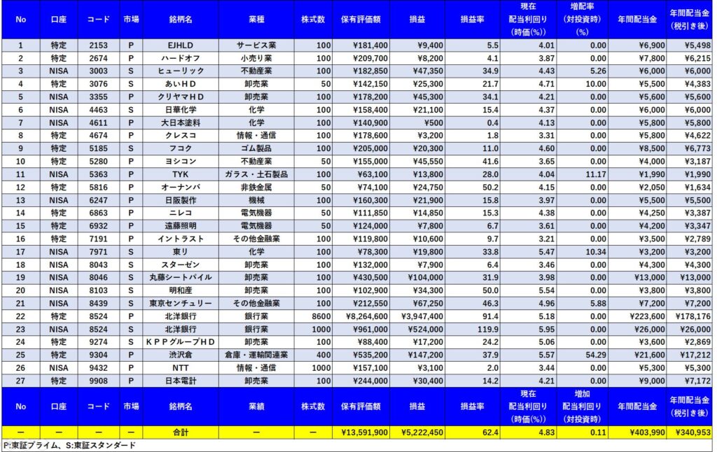 ●現在、26銘柄(特定口座で14銘柄、NISA口座で13銘柄、北洋銀行は両方の口座で保有)保有で、