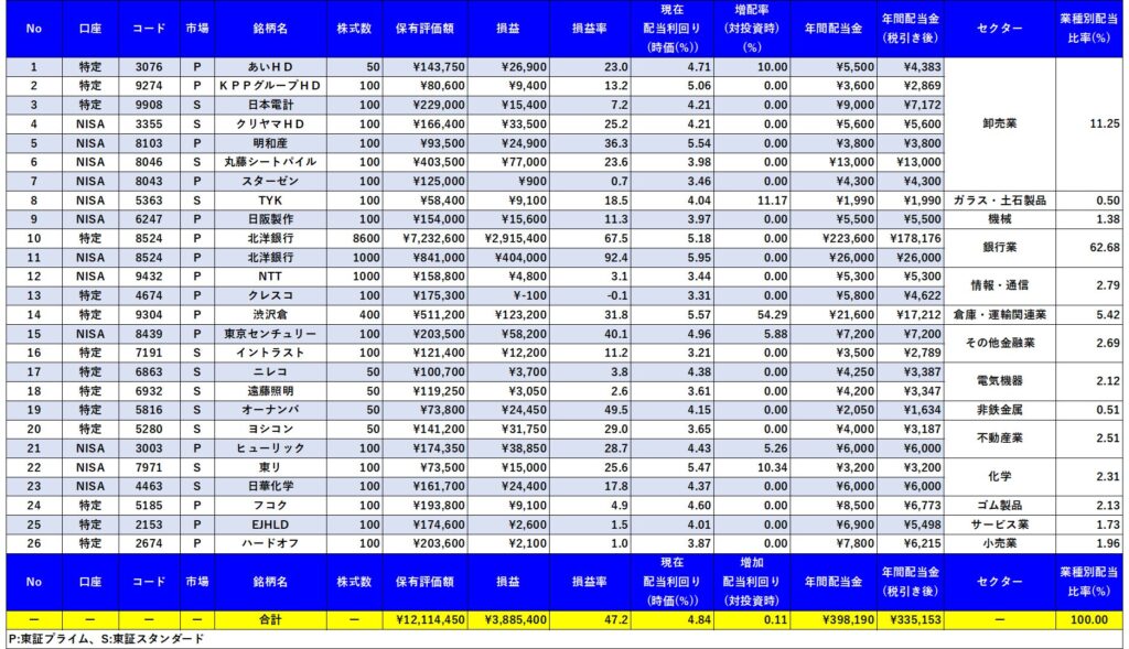 現在、25銘柄(特定口座で14銘柄、NISA口座で12銘柄、北洋銀行は両方の口座で保有)保有で、